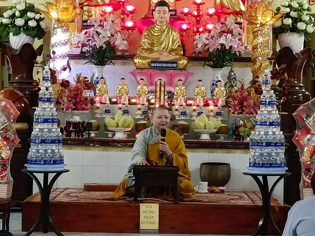 Sau thời khoá niệm Phật, Ni sư trụ trì chia sẻ Phật pháp về Pháp môn niệm Phật, lấy ba kinh làm nền tảng căn bản, hướng dẫn Phật tử về phương pháp trì danh niệm Phật, và cách điều phục thân tâm trước nghịch cảnh.