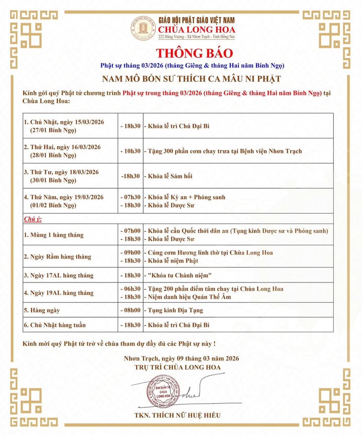 THÔNG BÁO PHẬT SỰ THÁNG 03 tại Chùa Long Hoa, kính quý Phật tử quan tâm tham dự đầy đủ